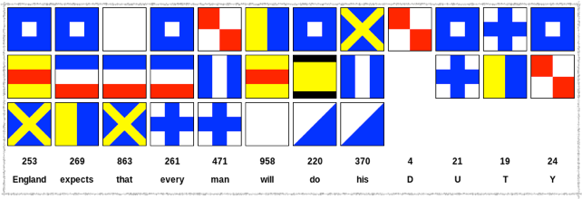 Monday 21 October 1805. His Lordship came to me on the poop, and after ordering certain signals to be made, about a quarter to noon, he said, 'Mr. Pasco, I wish to say to the fleet, ENGLAND CONFIDES THAT EVERY MAN WILL DO HIS DUTY' and he added 'You must be quick, for I have one more to make which is for close action.' I replied, 'If your Lordship will permit me to substitute the confides for expects the signal will soon be completed, because the word expects is in the vocabulary, and confides must be spelt,' His Lordship replied, in haste, and with seeming satisfaction, 'That will do, Pasco, make it directly.'